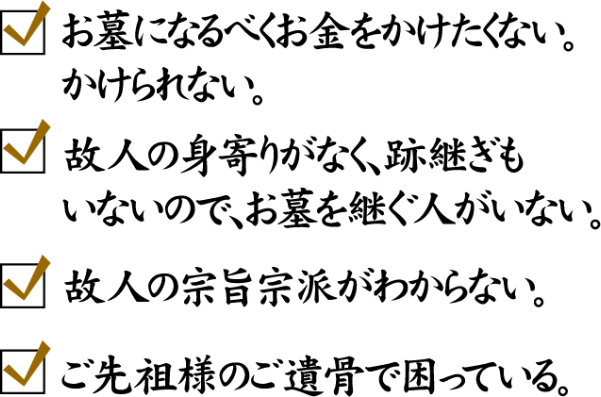 「お付き合いのある霊園がない」「個別永代供養墓が高くて買えない」「故人の宗派がわからない」「お墓にお金をかけたくない、かけられない」「故人の身寄りがなく、跡継ぎもいないので、お墓を継ぐ人がいない」など、納骨や先祖のご遺骨でお困りの方は是非ご利用ください。