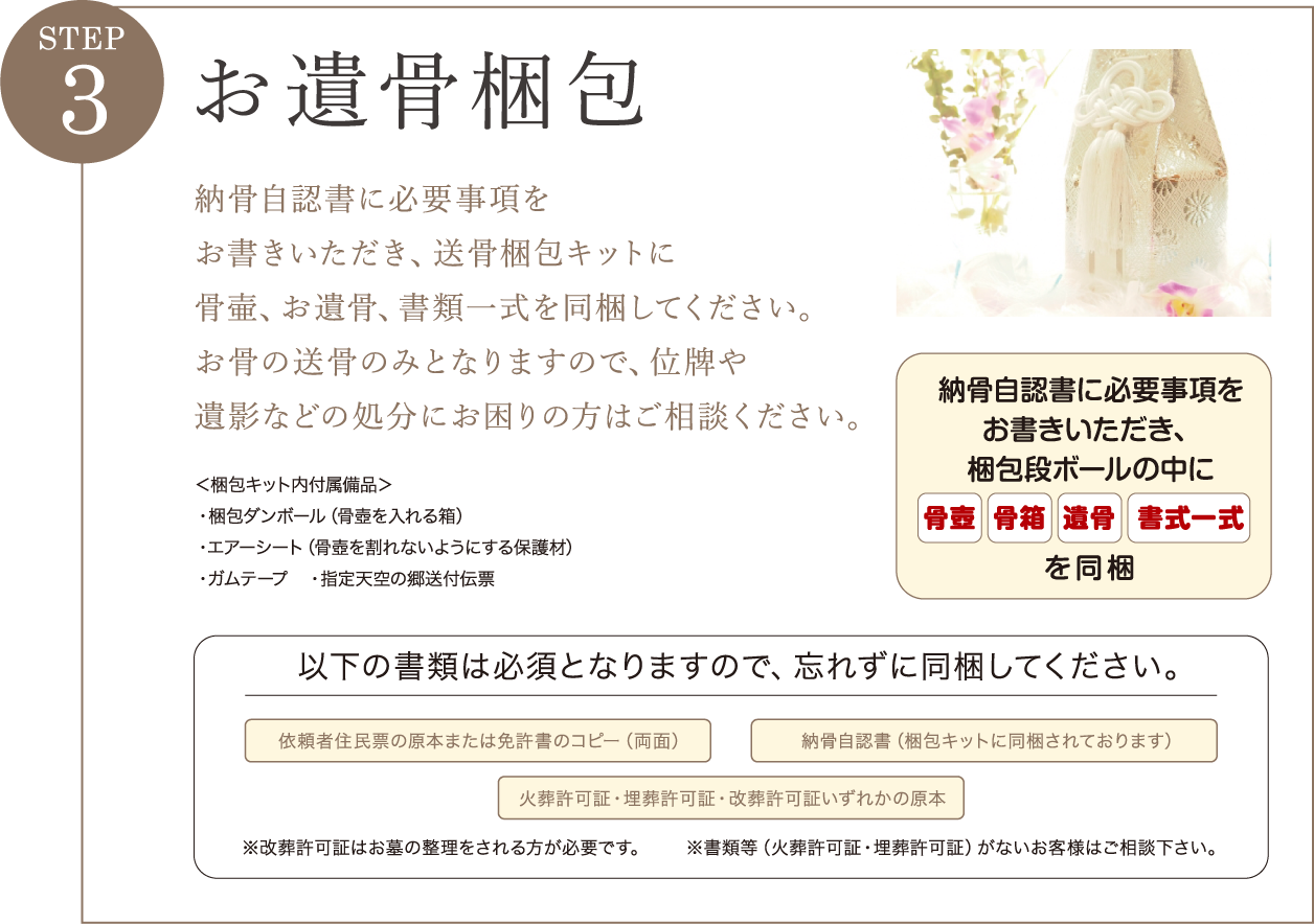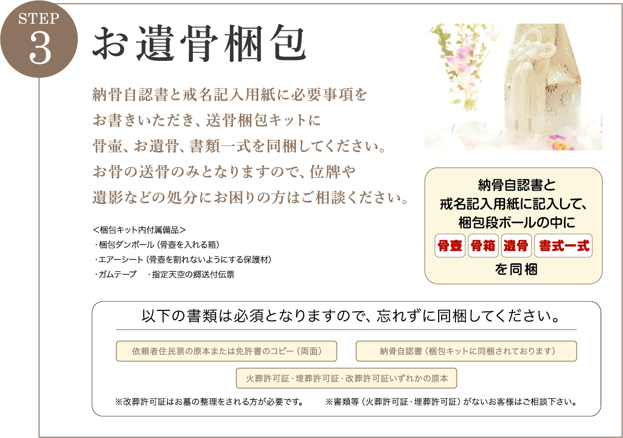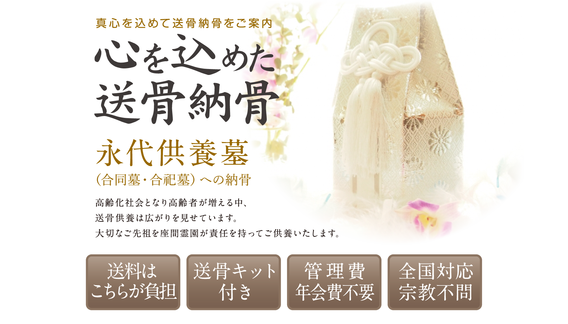 送骨納骨はご先祖様の遺骨を天空の郷に郵送することで、天空の郷が永代納骨及びご供養していただけるサービスです。お墓(墓地・墓石)を購入するのと違い、永代供養料を一式支払えば、永代にわたる供養の全てをお寺にお任せるすることができます。